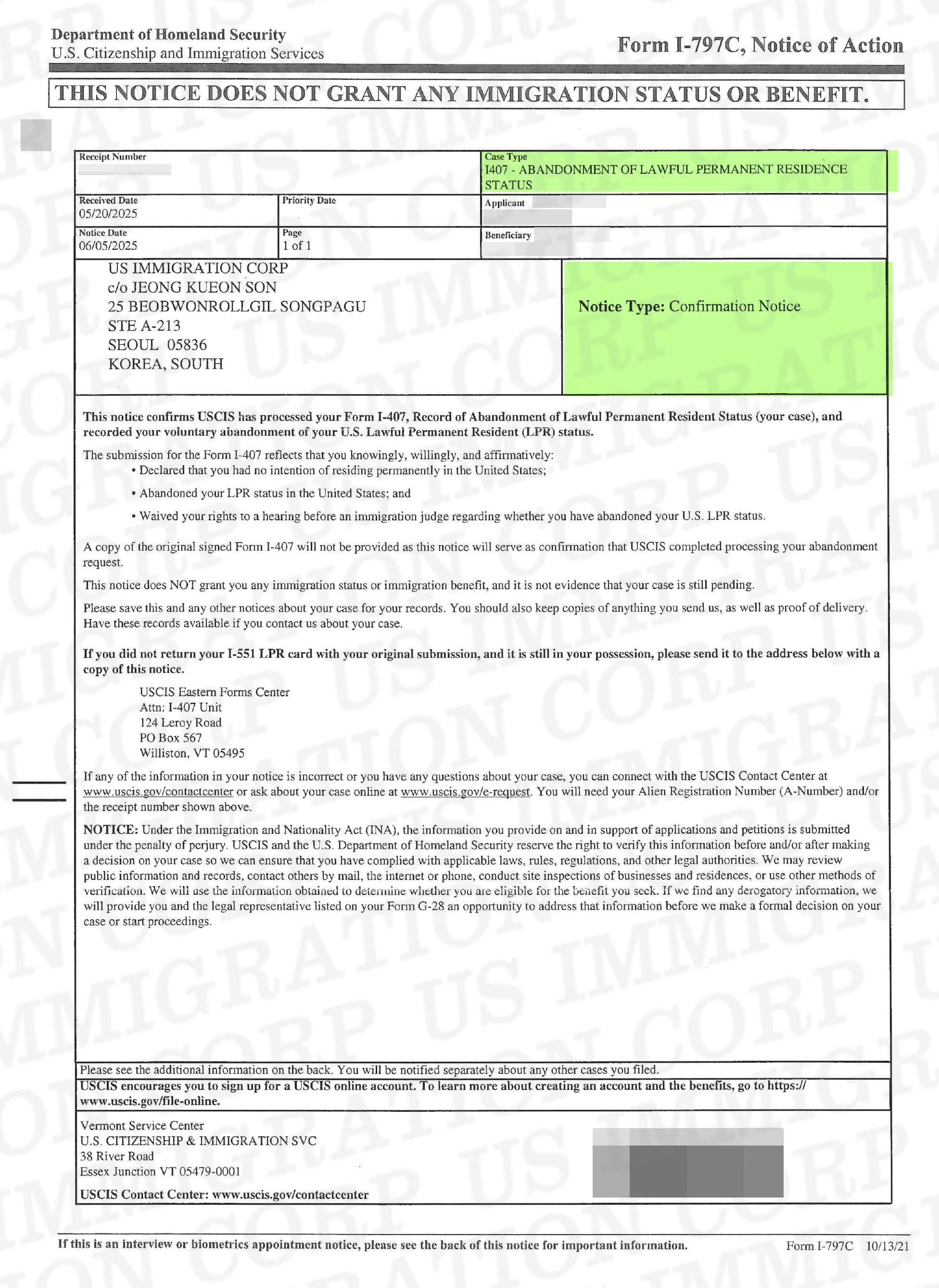 불이익 없이 영주권 포기 승인이 이루어졌으며,