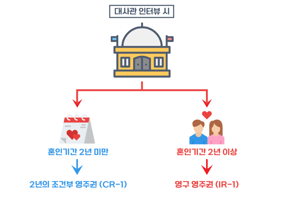 혼인 기간이 영주권 승인 시점에 2년 미만인지, 2년 이상인지에 따라