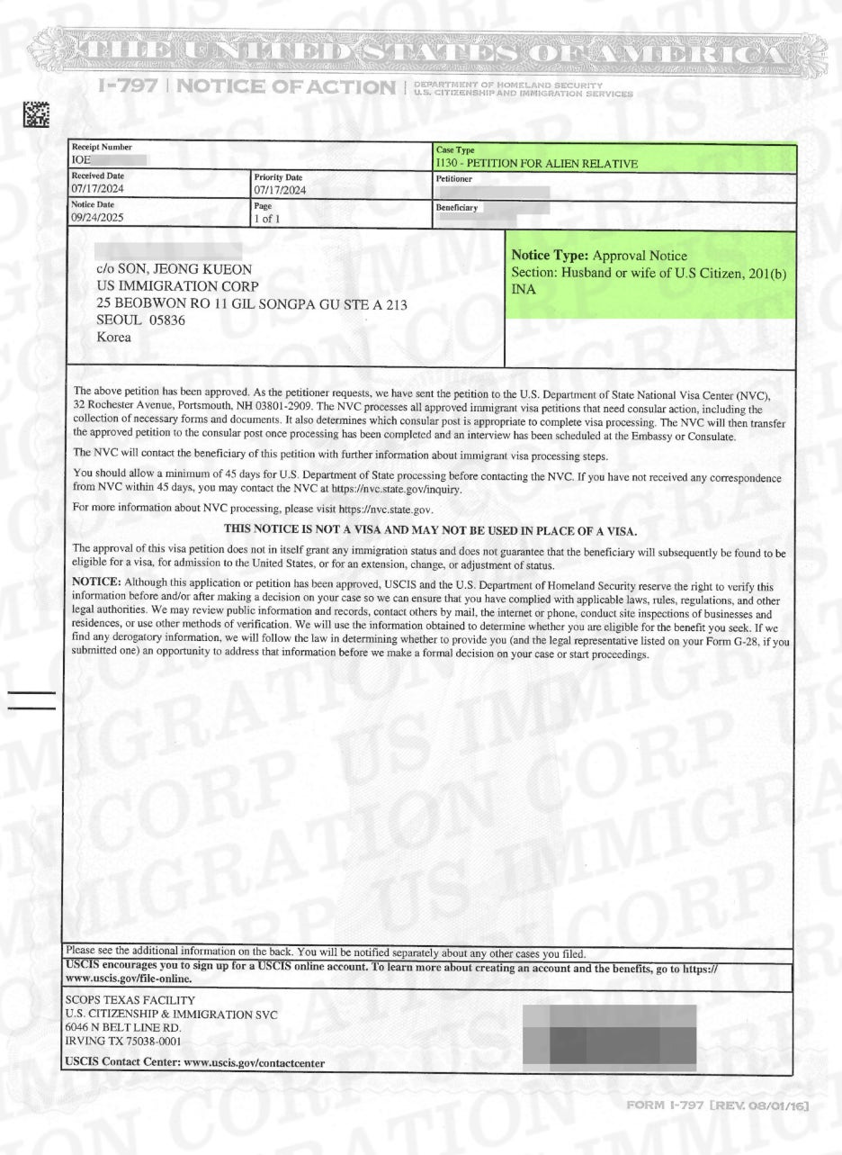 | [US 이민법인] 미국 배우자 초청 CR-1 비자 I-130 청원, 약 1년 2개월 소요 후 승인 (0) | 2025.10.07 |