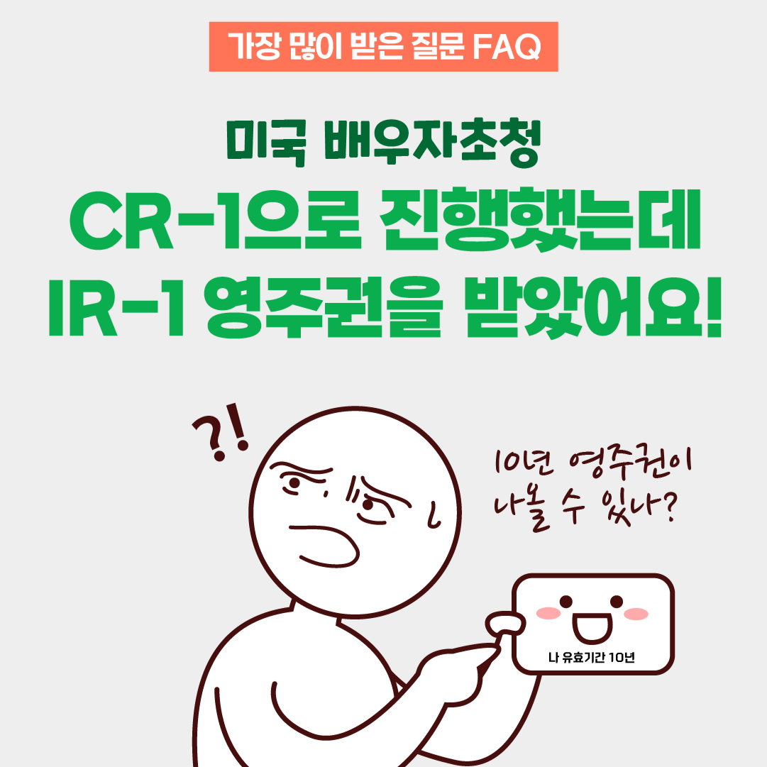 이번 주제는 "미국 배우자초청, CR-1으로 진행했는데IR-1 영주권을 받았어요!" 입니다.