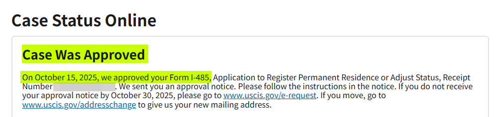 신분조정(AOS)절차를 통해 영주권을 승인받으셨습니다.