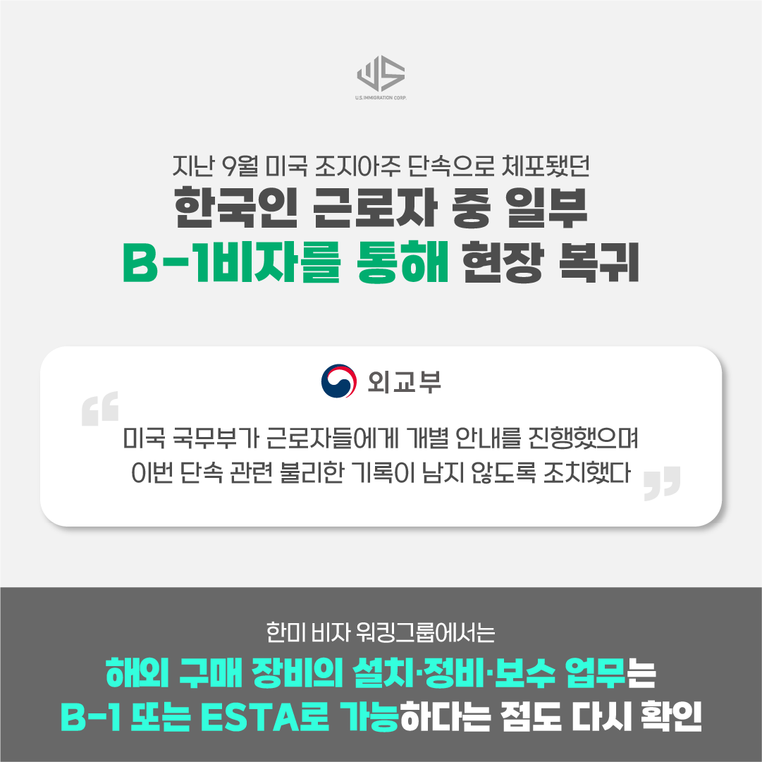 앞서 지난 9월30일 워싱턴DC에서 열린 한미 양국 정부 간 상용 방문 및 비자 워킹그룹 회의에서 미 측은 우리 기업들이 대미 투자 과정에서 수반되는 해외 구매 장비의 설치(install), 정비(service), 보수(repair) 활동을 위해 B-1 비자를 활용할 수 있다는 점과, 무비자 전자여행허가(ESTA)로도 B-1 비자 소지자와 동일한 활동이 가능하다는 것을 재확인했다고 한국 외교부가 밝힌 바 있다