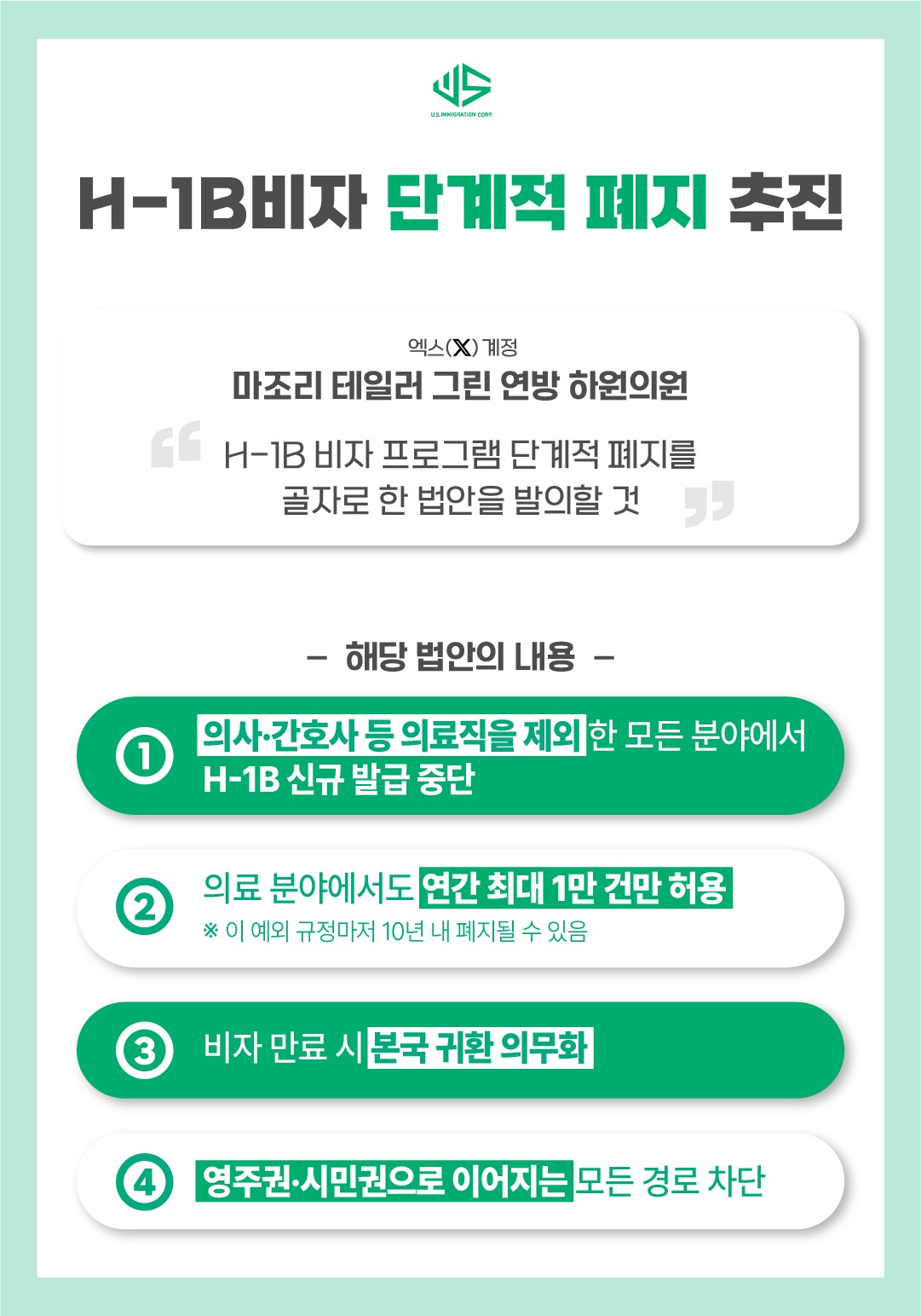 해당 법안은 비자 만료 시 소지자가 반드시 본국으로 돌아가도록 의무화하고, 영주권·시민권으로 이어지는 경로도 전면 차단하는 내용을 담고 있다. 그린 의원은 이를 두고 “그동안 남용으로 얼룩진 H-1B 제도를 본래 취지인 임시 체류 비자로 되돌리는 조치”라고 주장했다.