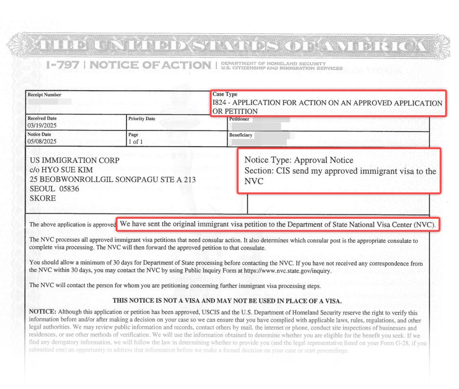 특히, I-824 승인을 거쳐 NVC로 정보가 넘어가는 절차까지 포함하면