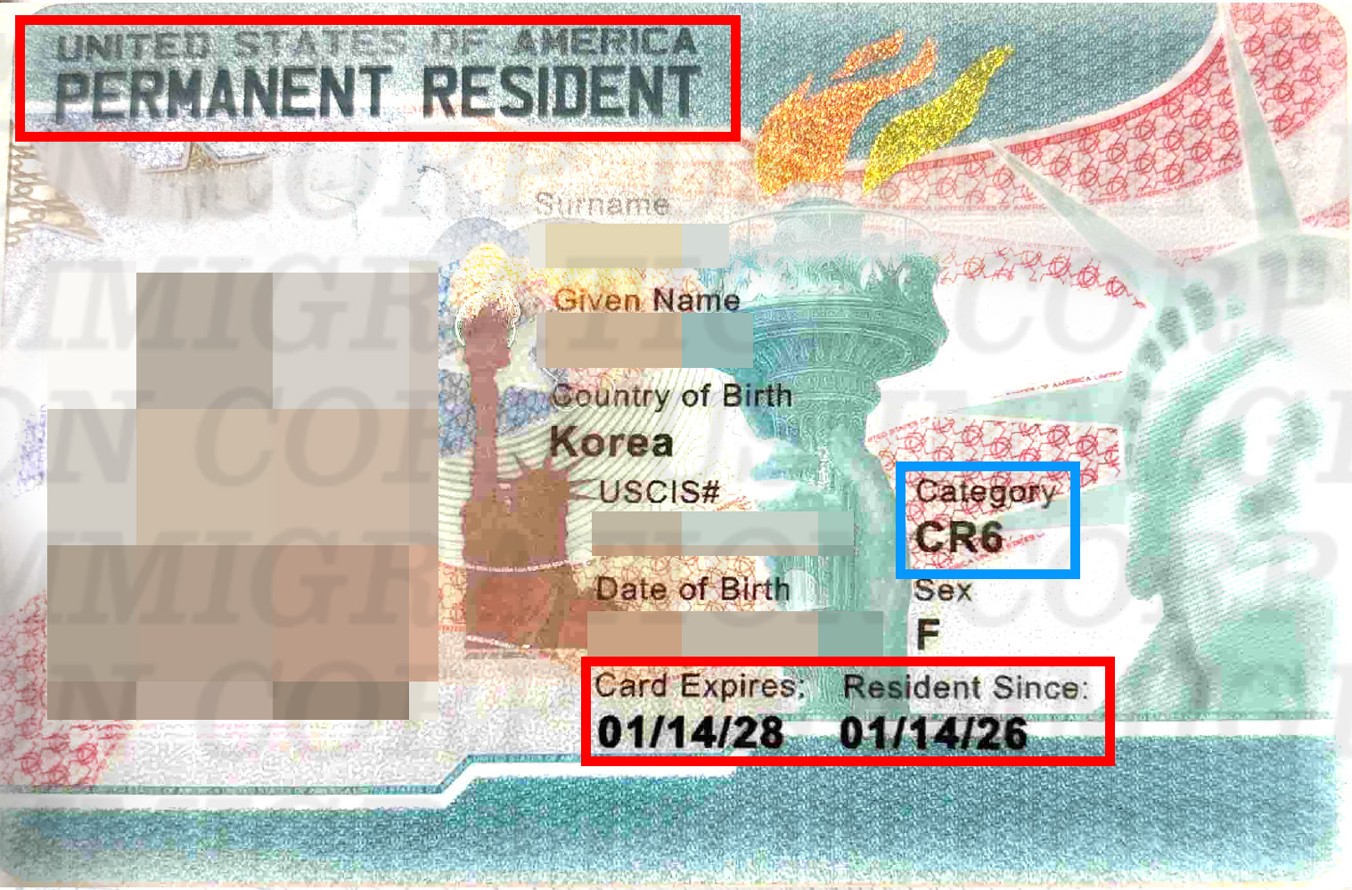 고객님은 영주권 카드(Green Card) 를 수령하셨으며,