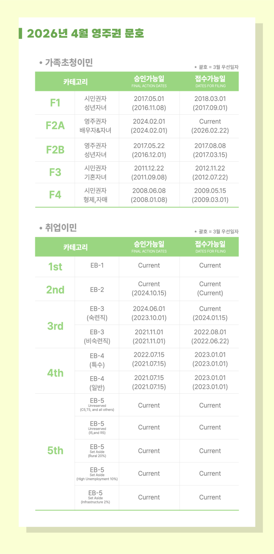 취업이민과 가족이민의 영주권 문호가 오랜 만에 활짝 열리면서 대부분 진전된 것으로 나타났다. 연방국무부가 17일 발표한 2026년 4월 중 영주권 문호에 따르면 석사 이상 고학력자들을 대상으